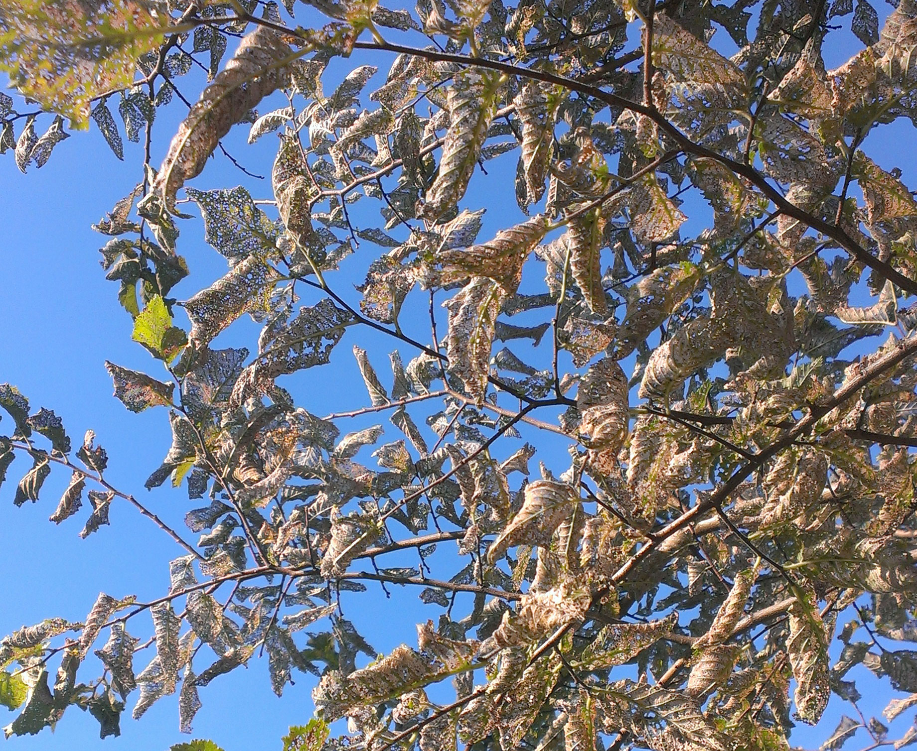 Due to the Elm Leaf Beetle, leaves that are attacked die and give Elms a general brown colour. Repeated infestations will weaken the Elms and make them prone to branch dieback as well as other insect and fungal problems.